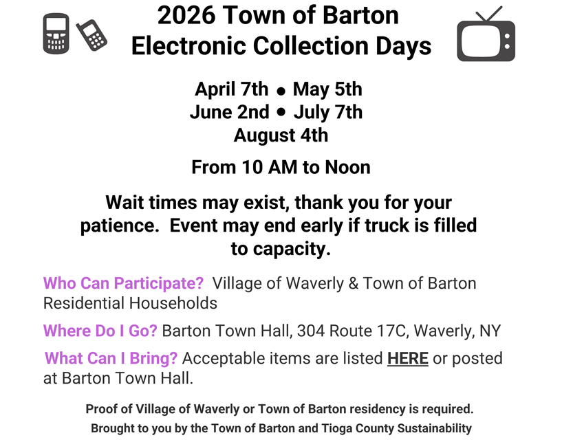 Town of Richford Electronic Recycling Program is now opened to all Tioga County residents. For more information see their website: